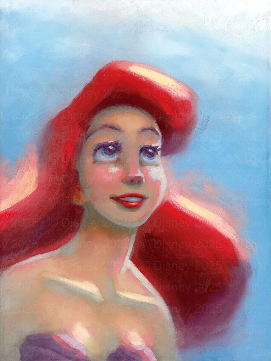 Ariel looks up toward the light of the world outside of the water, the place that captured her curiosity. I painted this piece in such a way that Ariel would be immersed in light, a suggestion of her hope, imagination, and excitement for the discoveries waiting for her above.
