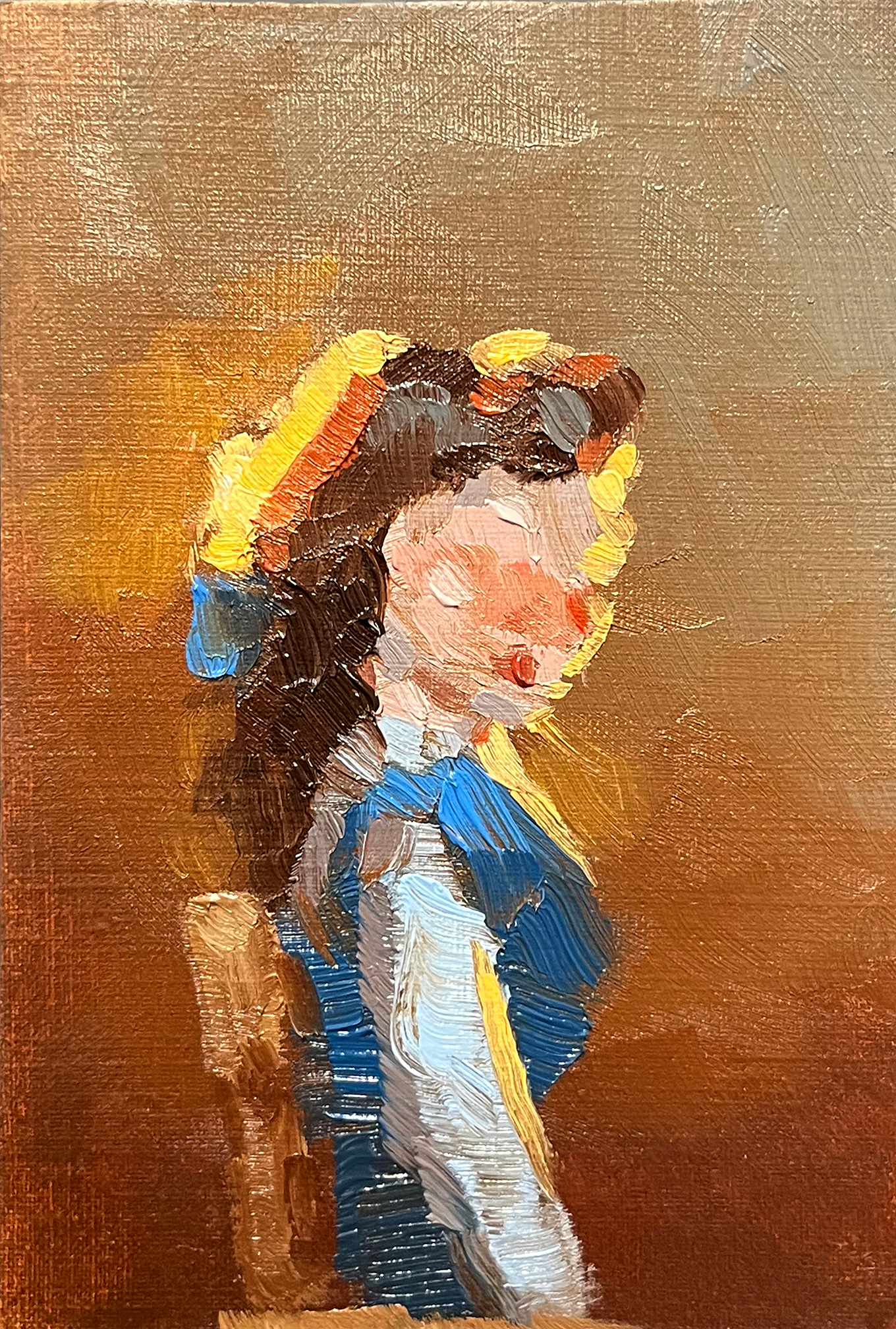 I imagined Belle was reading a book for the majority of the time she sat for her portrait, until it was time to paint her face, at which point I had her turn her head toward the viewer. In my mind, she's still holding out of frame the book she was reading. In terms of posing, Belle's torso being turned away from the viewer was a deliberate statement of humility and a sign of where she places her attention. To her, her portrait is almost an afterthought in light of her values; she is not vain. I like to think that this portrait was painted for her father.