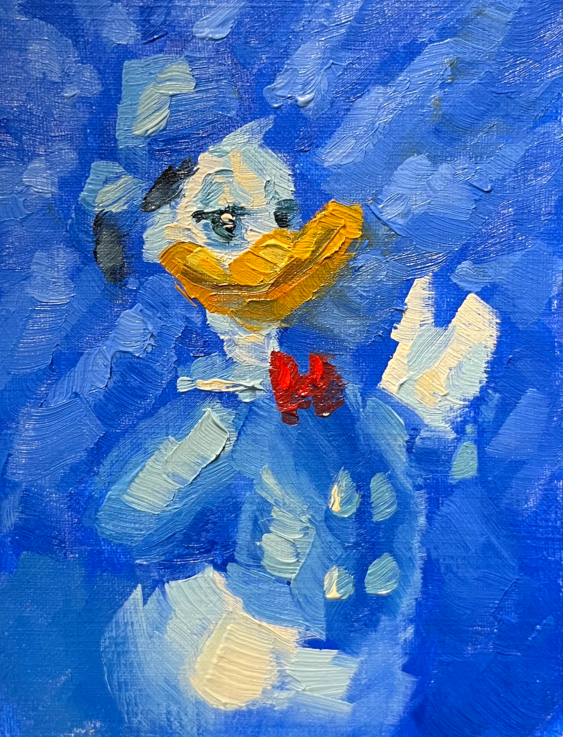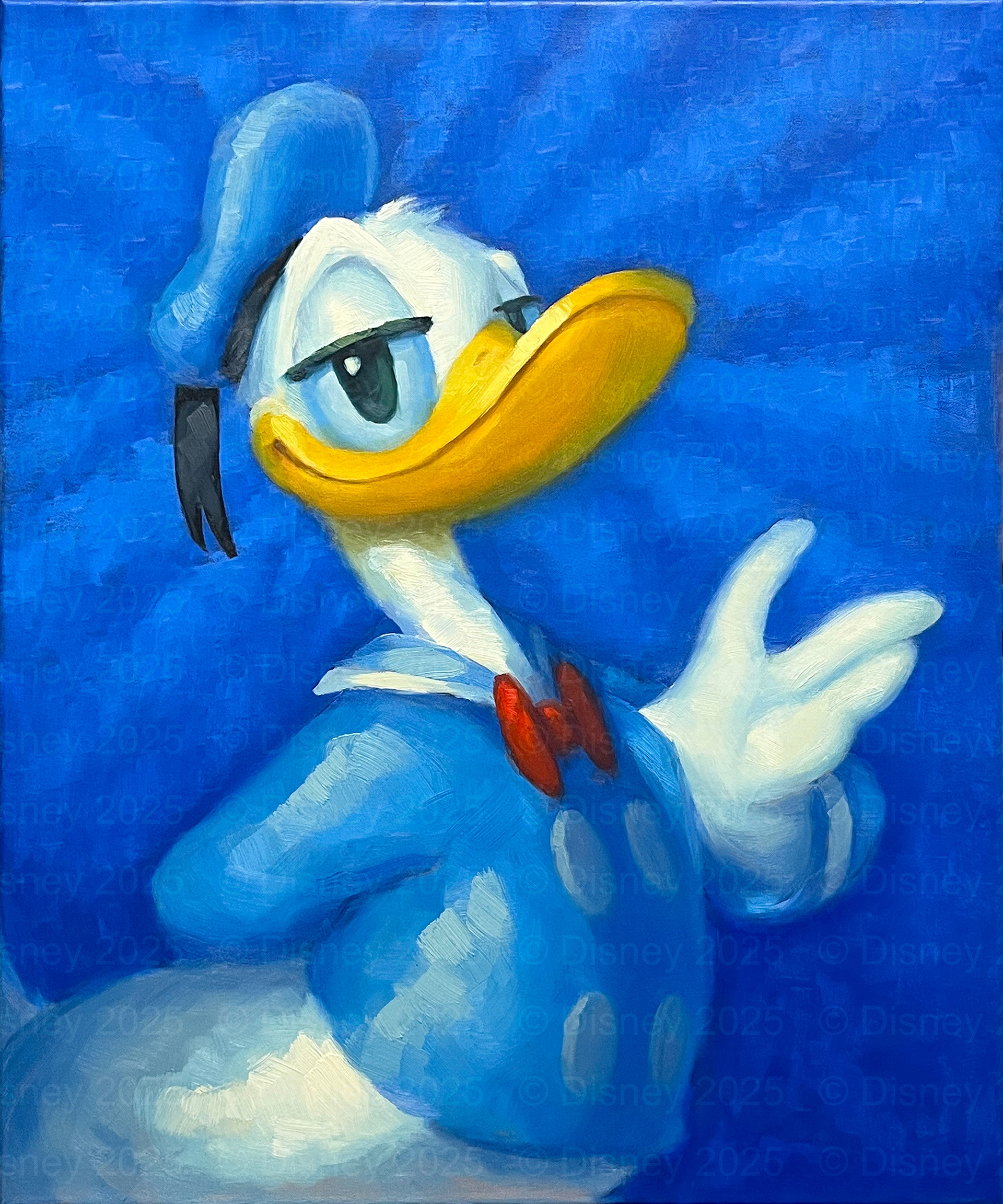 The backdrop of this piece was inspired by the title cards of Donald's classic cartoons. It was painted with a specific brush and technique that created a distinctive reflective pattern that pops the figure forward when the painting is viewed at an angle.