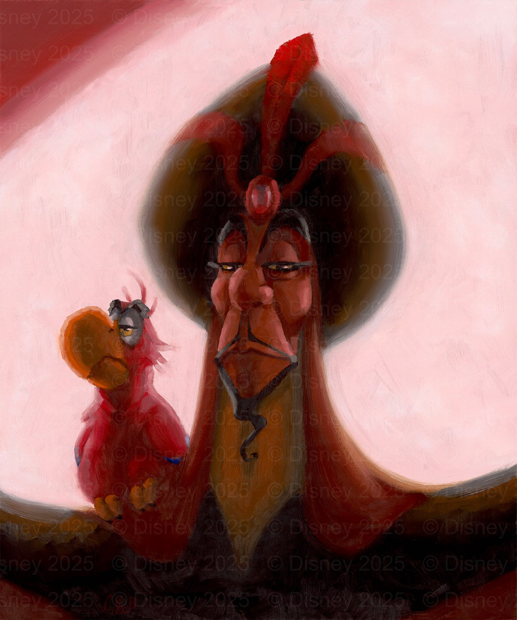Jafar's introduction scene in Aladdin inspired the setting of this portrait. Strong backlighting—a technique called contre-jour, meaning "having the sun or other light source behind a subject"—is not only interesting to paint but also suits Jafar's character. Here, we see Jafar dwelling in shadow, the light behind him giving off an almost oppressive air. I found this to be an apt way of depicting Jafar's deceitful and sinister character; he is the Grand Vizier to the Sultan, yet his true intentions are geared towards his own hunger for power. Casting Jafar in shadow reflects how Jafar hides his true intentions.
