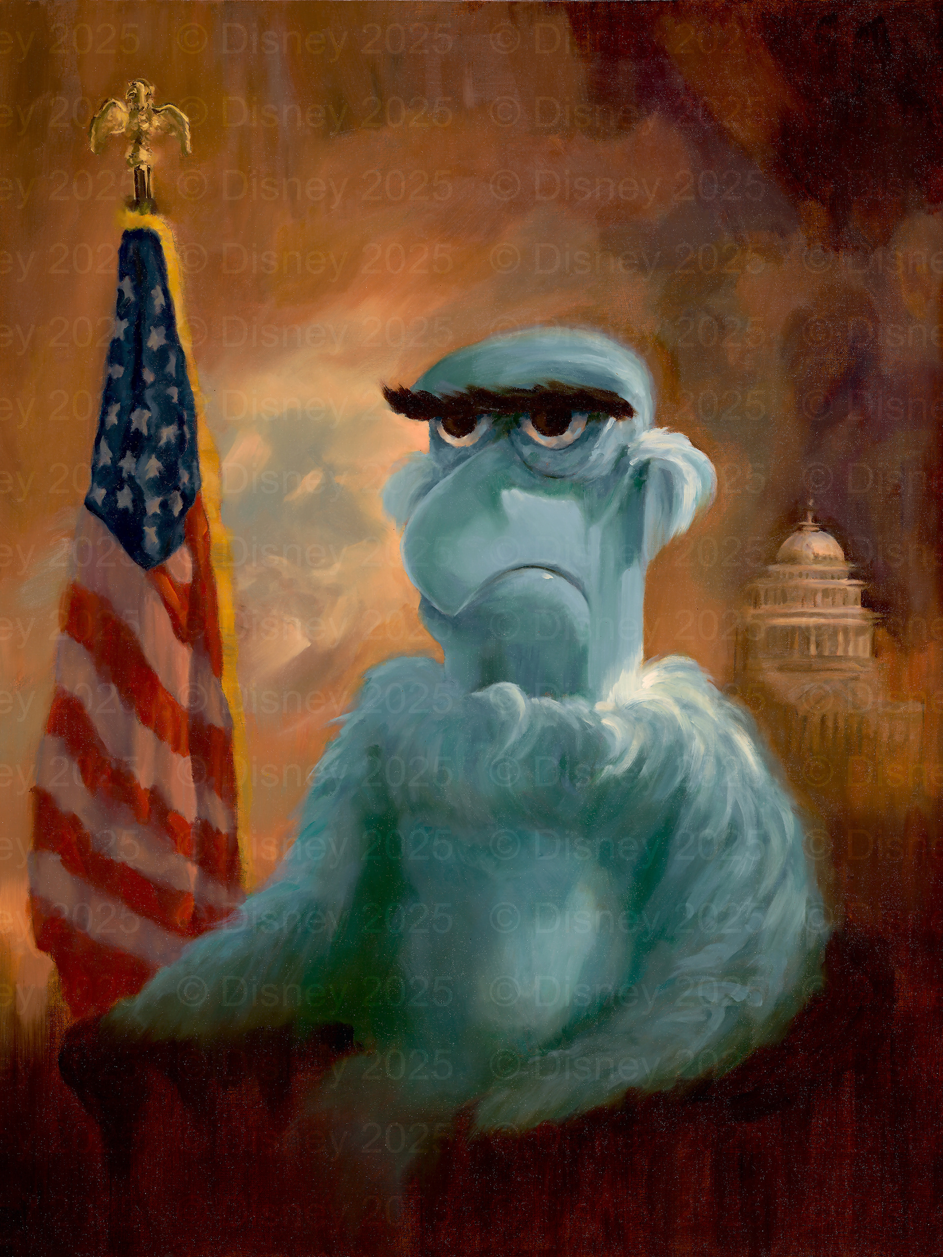 “How does Sam Eagle see himself? How would he depict himself?” These questions came to mind when I decided to paint Sam. Patriotically—that was the obvious answer. I loved the idea of depicting Sam Eagle in a presidential portrait. In size, color, medium, and composition, this painting is inspired by actual presidential portraiture. It's a personal favorite of mine.