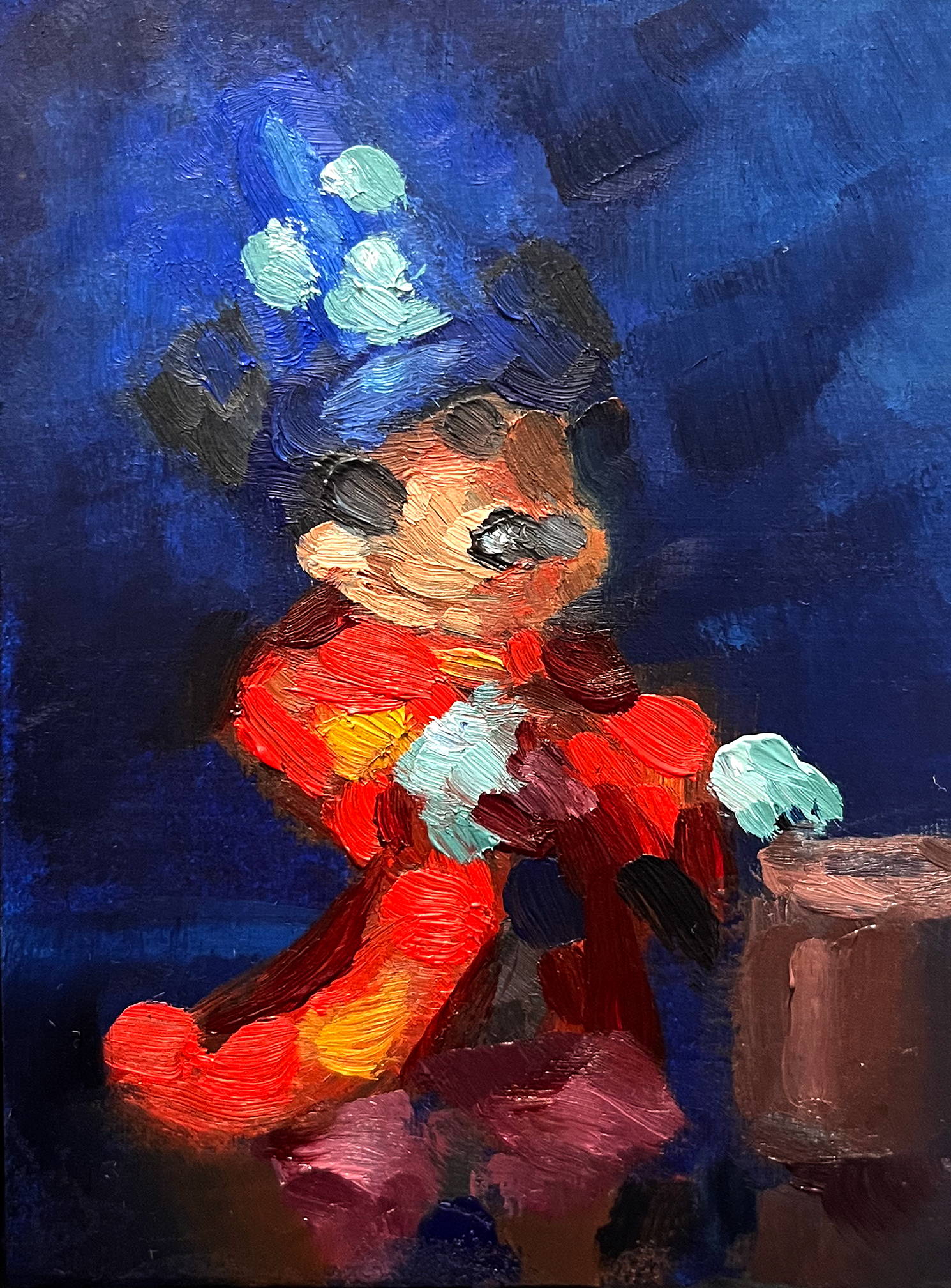 It's funny to us, in a way, for Sorcerer Mickey to act like this, to pretend to be like Yen Sid, because, in pretending to be his mentor, his senior by far, Sorcerer Mickey exposes his own naivete. But this portrait tells a slightly different story. This depiction highlights Sorcerer Mickey's admiration for his mentor and his excitement for his own potential. Along these lines, to me, it was important not to include any sense of pride in Sorcerer Mickey's demeanor. What's shown instead is a purity and innocence that make the character so endearing; apprentice Sorcerer Mickey is simply happy to be where he is. I think he would make a great sorcerer one day.
