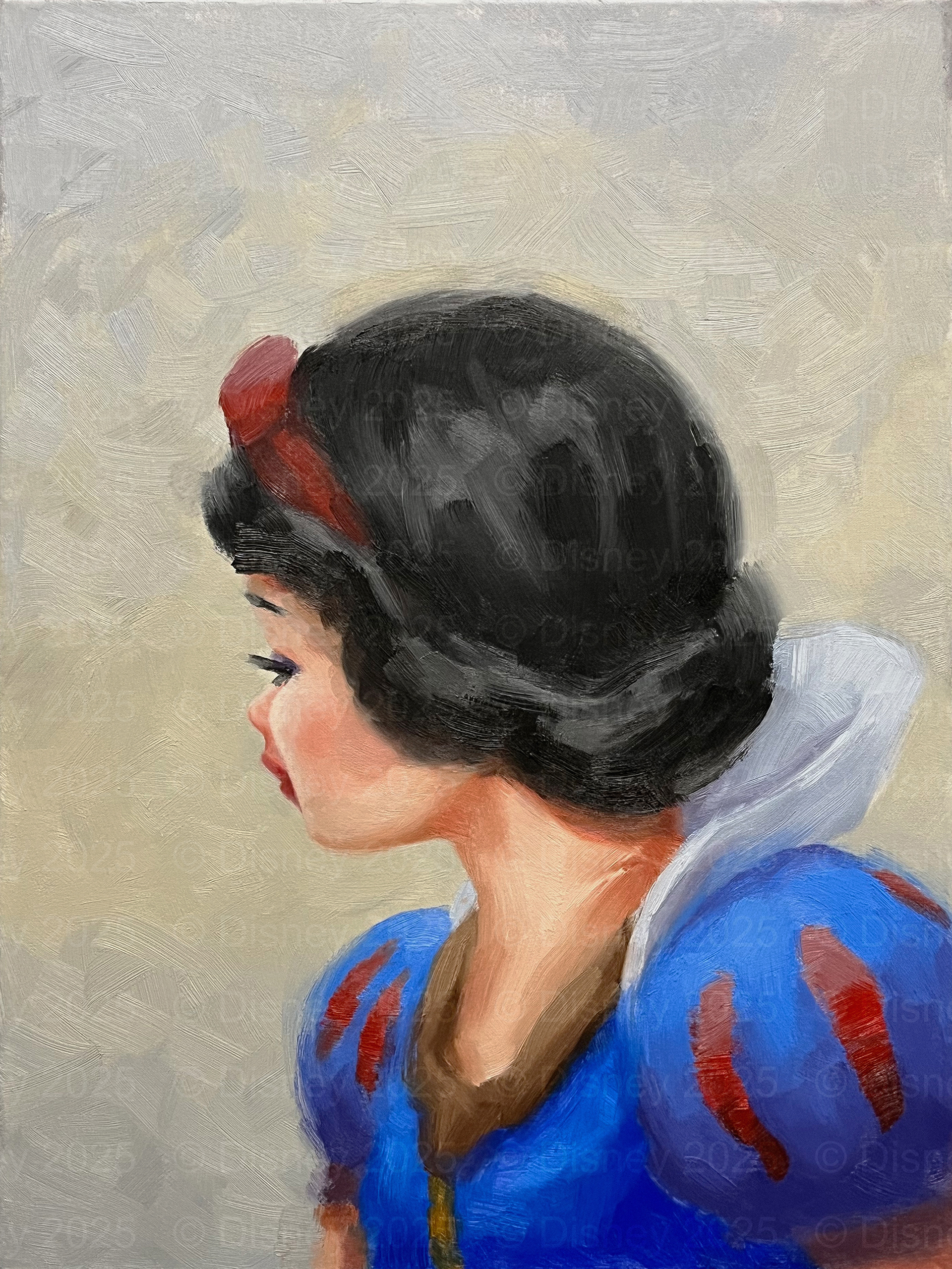 The idea for this painting started while I was studying the lighting condition known as diffuse neutral light, which allows one to see the true, natural color of materials, unchanged by direct sunlight. With Snow White's portrait, I wanted to emphasize the humility of her character through posing—she is "fairest of them all," yet in her royal portrait, she looks away from the viewer in introspection. I felt that this was the most fitting way to depict her, humble and demure.